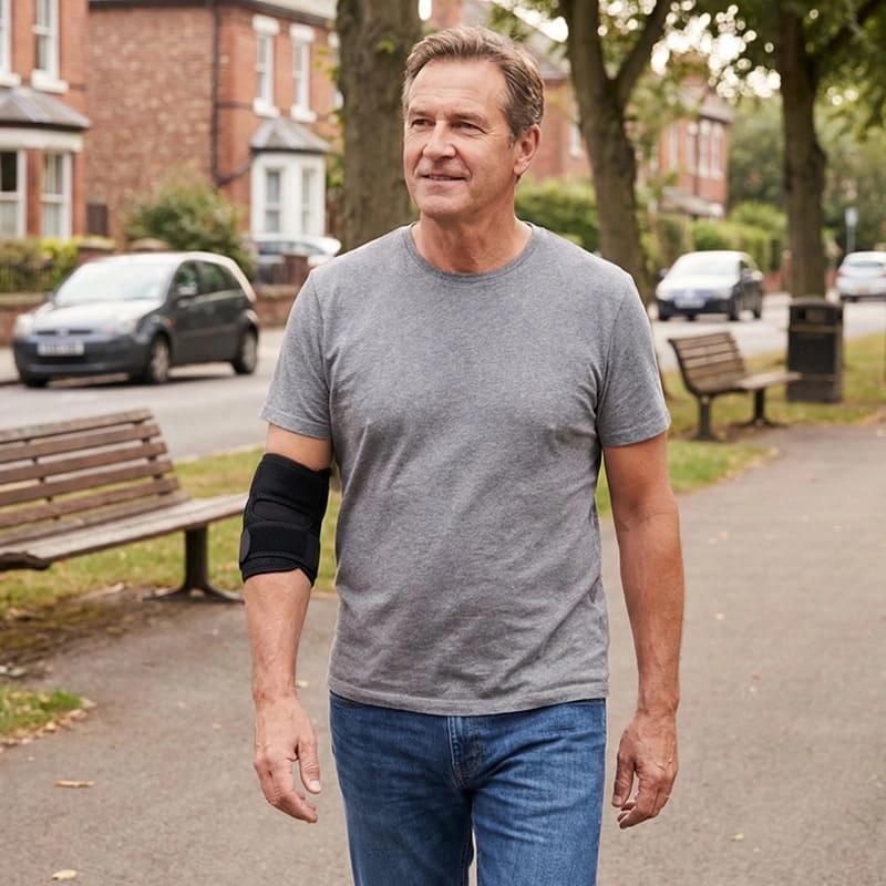 J’aime pouvoir l’ajuster facilement. Elle reste bien en place pendant que je jardine ou promène mon chien, et mon coude se sent très bien.