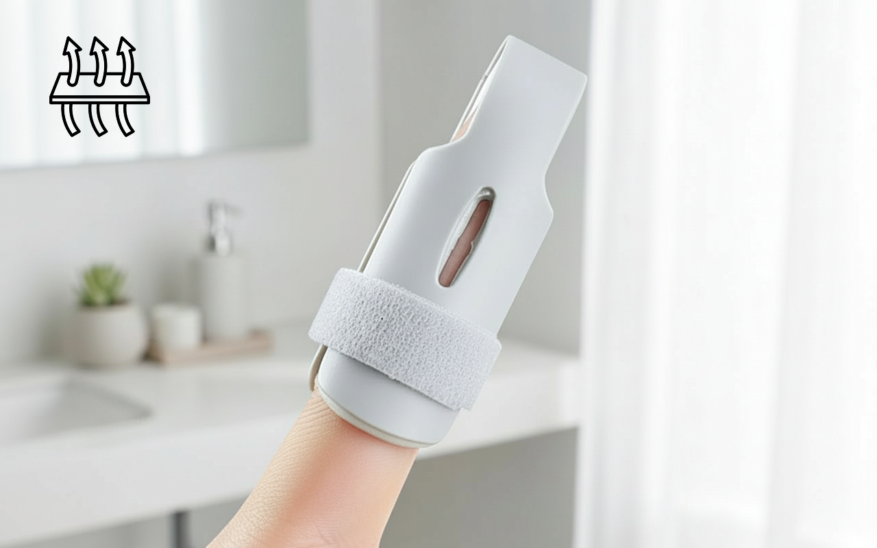 Des trous spéciaux permettent à l'air de circuler facilement, gardant la peau fraîche et sèche. Portez l'orthèse de doigt Ortorex plus longtemps sans transpirer ni ressentir de démangeaisons.