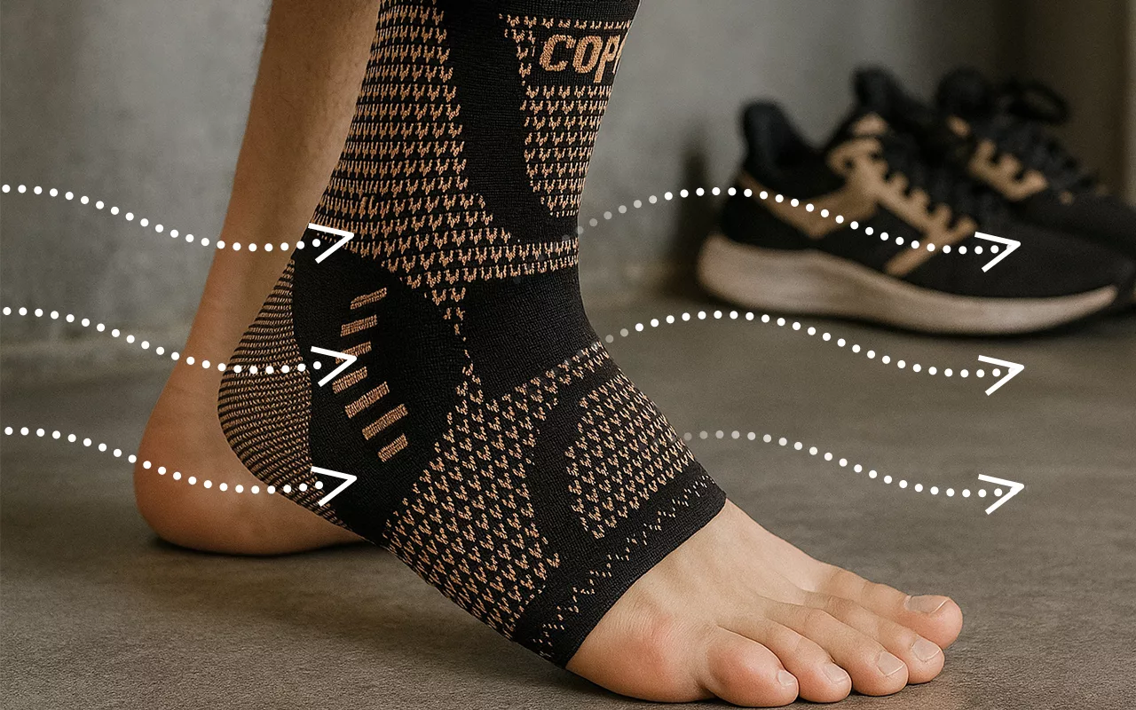 Le tissu imprégné de cuivre garde les pieds secs et frais toute la journée. Il prévient les mauvaises odeurs tout en laissant la peau respirer.