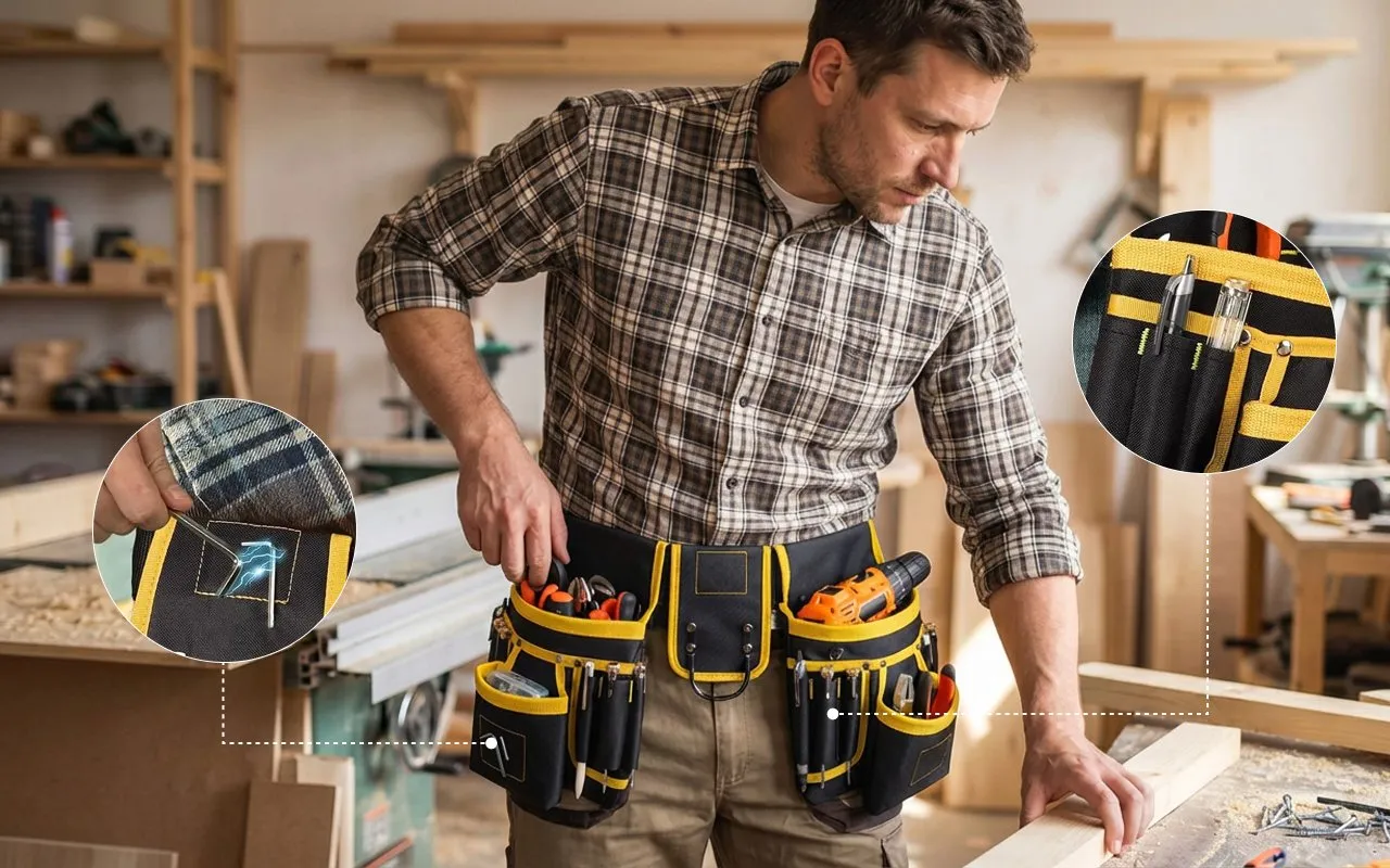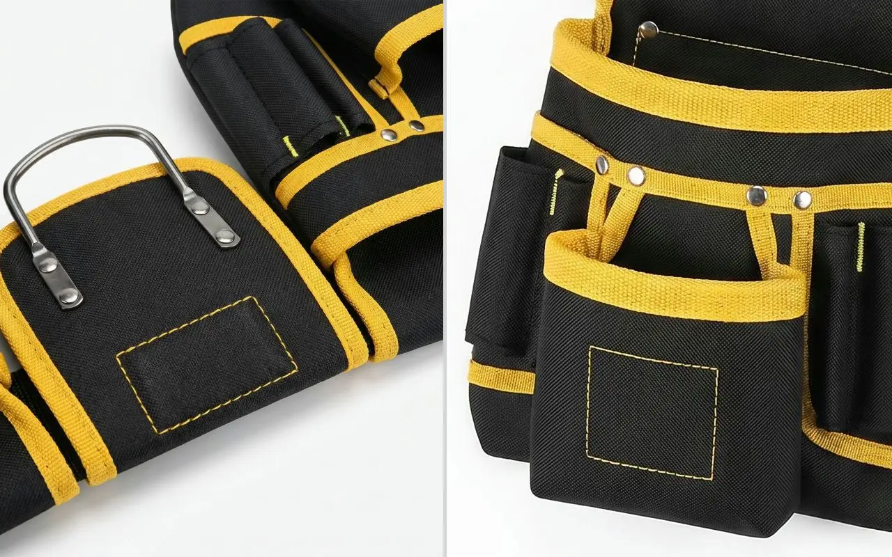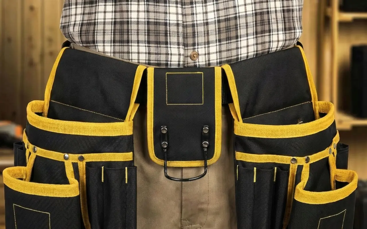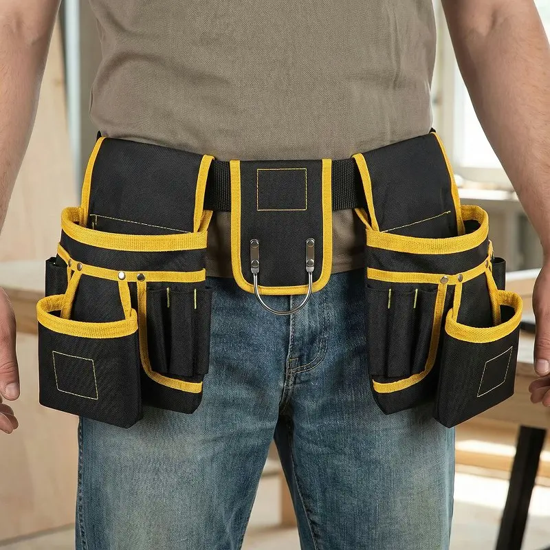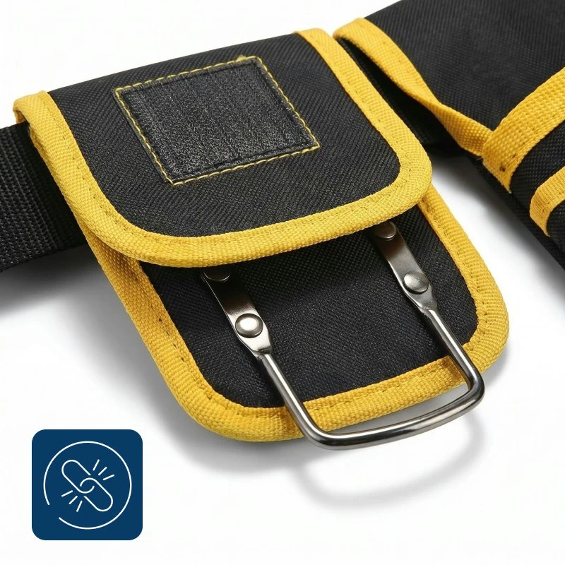 Je porte cette poche pendant mes longs services à câbler des maisons. La bande rembourrée soulage mes hanches, et je peux attraper le ruban, les coupe-fils, les vis sans même baisser les yeux.