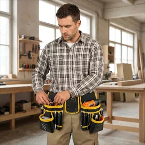 J’utilise la ceinture pour mes travaux de menuiserie dans mon garage. Le poids repose bien sur mes hanches, et les poches gardent les clous séparés des petits outils.