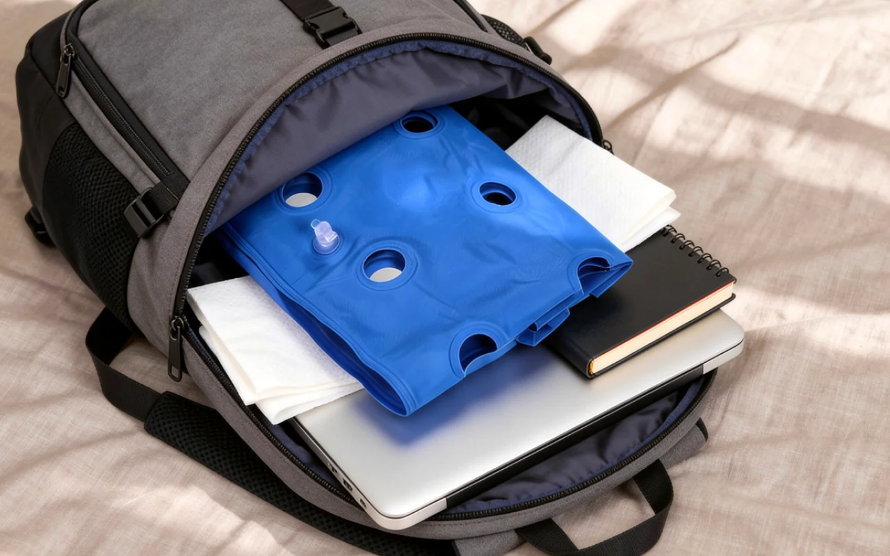 Emportez votre coussin Ortorex partout, du bureau aux voyages. Il se dégonfle rapidement pour un rangement facile et vous pouvez l'emporter où que vous alliez.