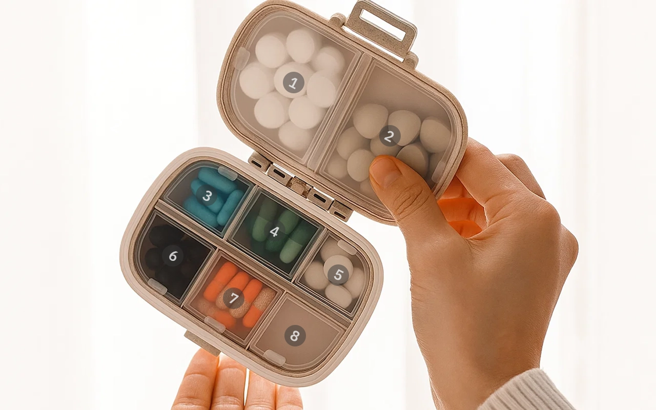 Vous pouvez trier vos doses par jour ou par type afin que rien ne soit mélangé. Chaque compartiment s'ouvre séparément, ce qui vous permet de prendre rapidement uniquement ce dont vous avez besoin.