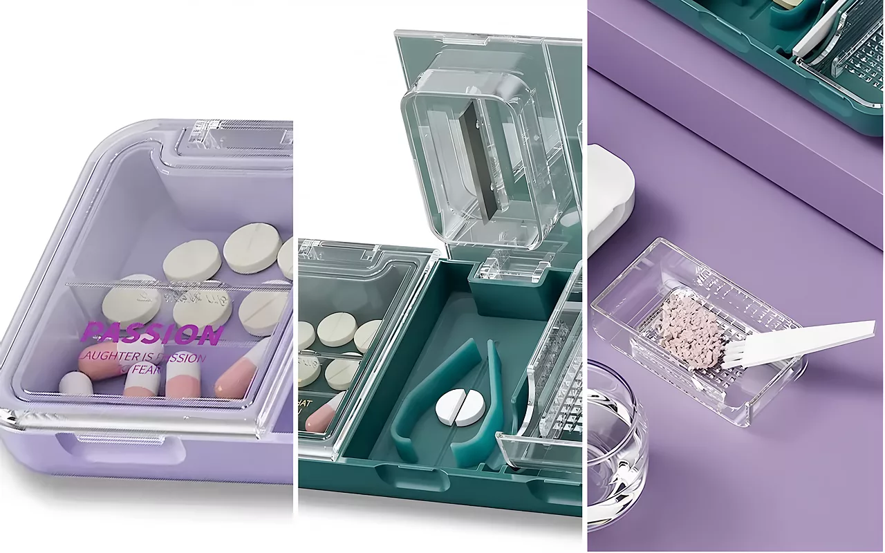 Trois fonctionnalités clés réunies dans un seul appareil simple. Stockez, divisez et écrasez les comprimés sans aucun désordre ni difficulté.