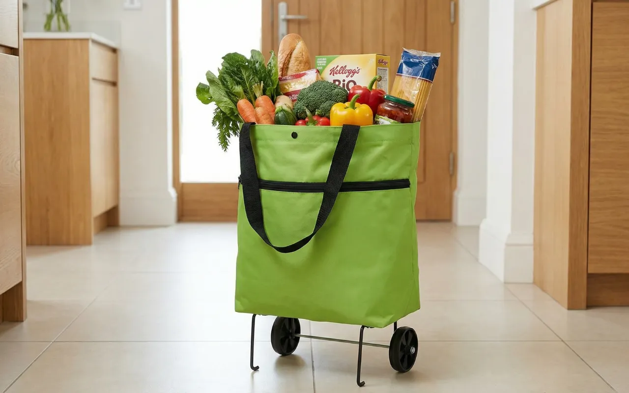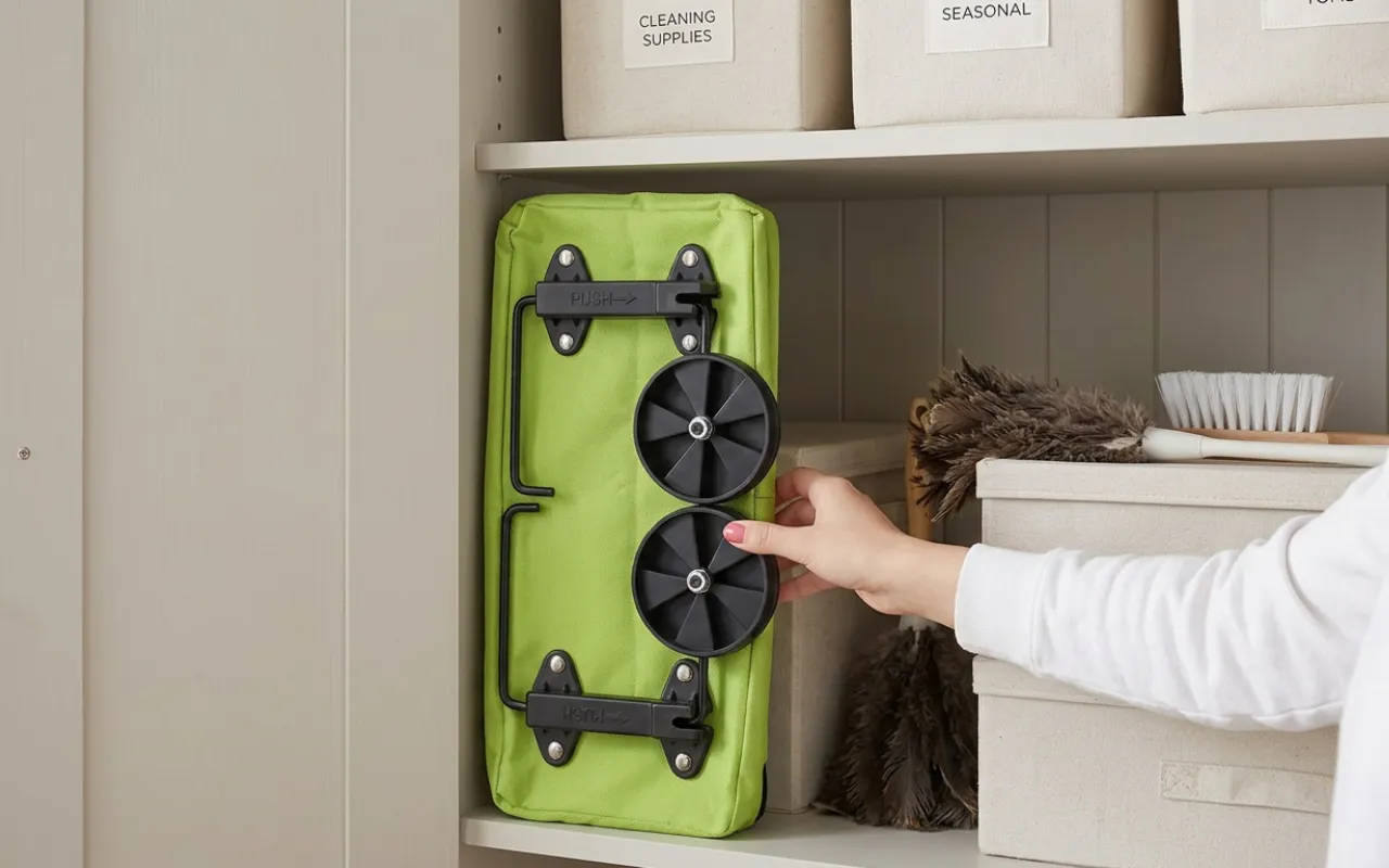 J’ai pris ce chariot après une opération de l’épaule. Maintenant je charge des bouteilles lourdes et des fruits sans m’inquiéter. Il se plie en quelques secondes et se glisse facilement à côté de l’armoire.