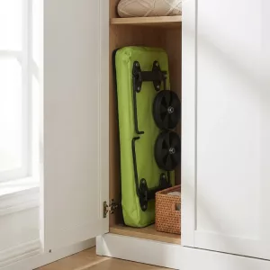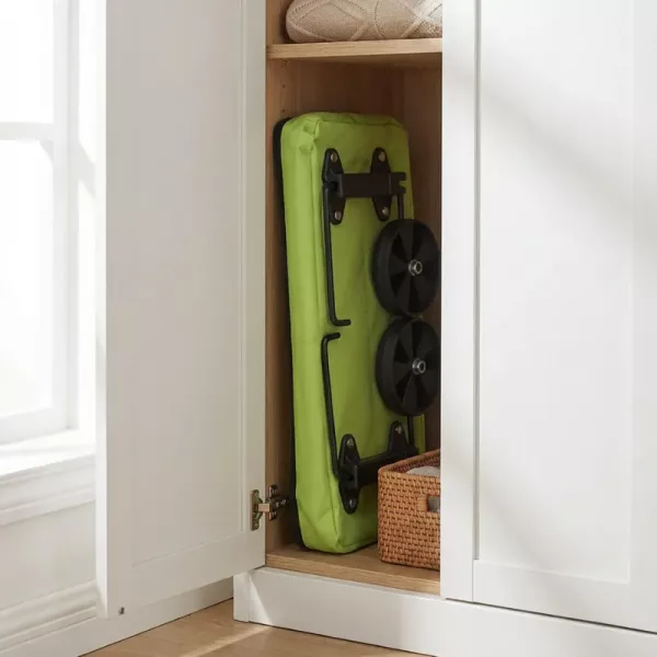 Le chariot se replie en un paquet mince qui tient dans les placards étroits. Sa structure légère se suspend discrètement derrière les portes, libérant un espace précieux dans le couloir.