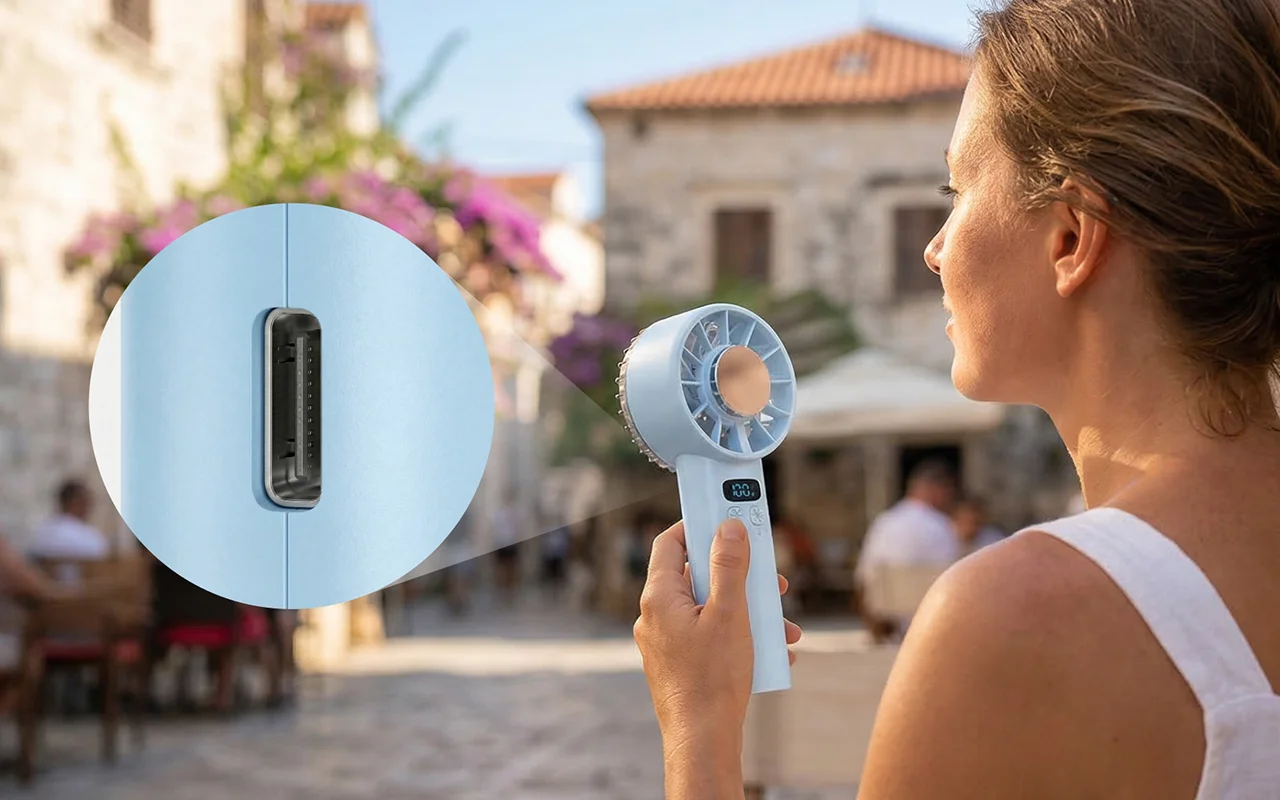 Je garde ce mini rafraîchisseur dans mon sac à langer pour les journées au parc. Il nous rafraîchit, le bébé et moi, et l’indicateur de batterie me rassure.