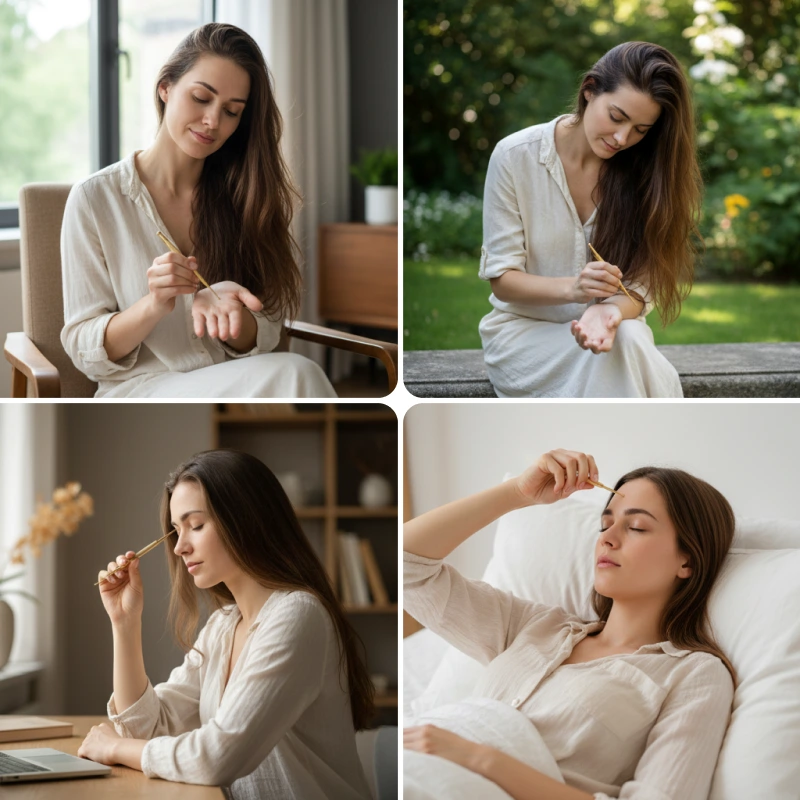 Je garde ce petit stylo dans mon sac à main et je l’utilise sur mon cou pendant les pauses au travail. Il fait fondre les tensions et m’aide à rester calme.