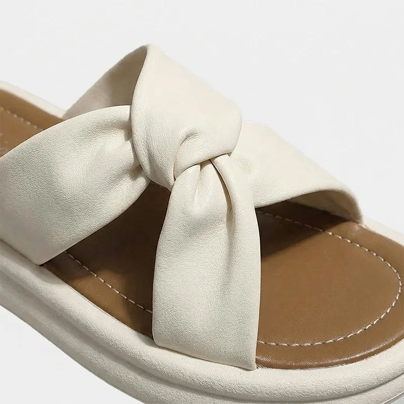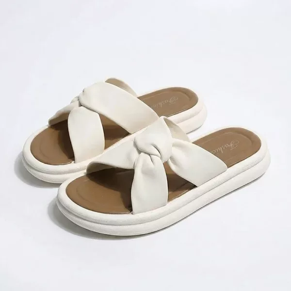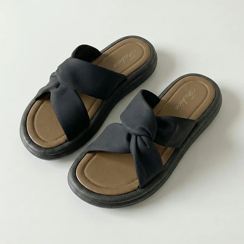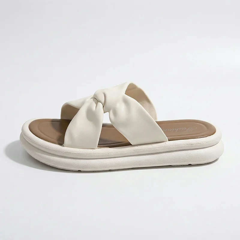 J’ai acheté ces sandales pour les courses du week-end et les promenades sur la plage. Elles s’enfilent rapidement, amortissent bien mes talons, et le joli nœud rend les tenues un peu plus habillées.