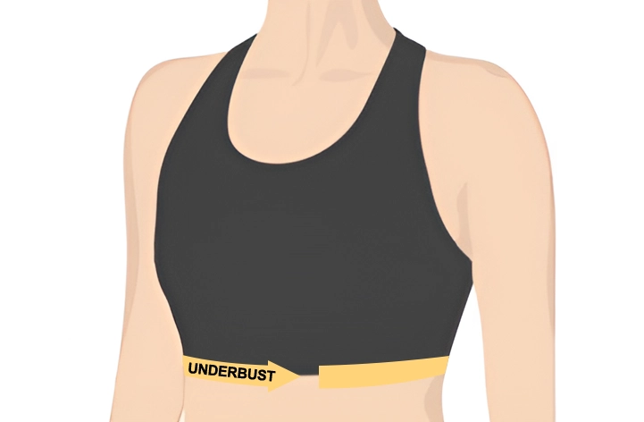 - 2. Pour trouver la mesure sous la poitrine, enroulez le mètre ruban autour de votre cage thoracique, directement et uniformément sous votre poitrine.
