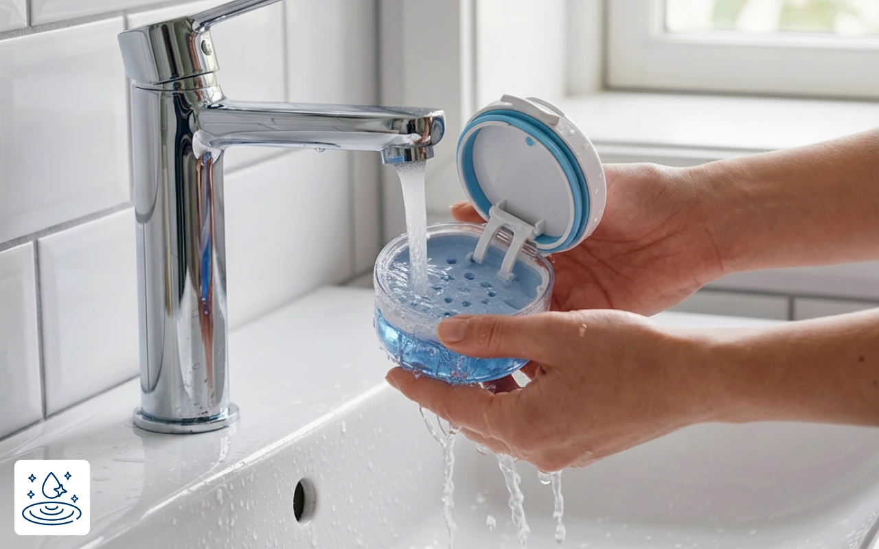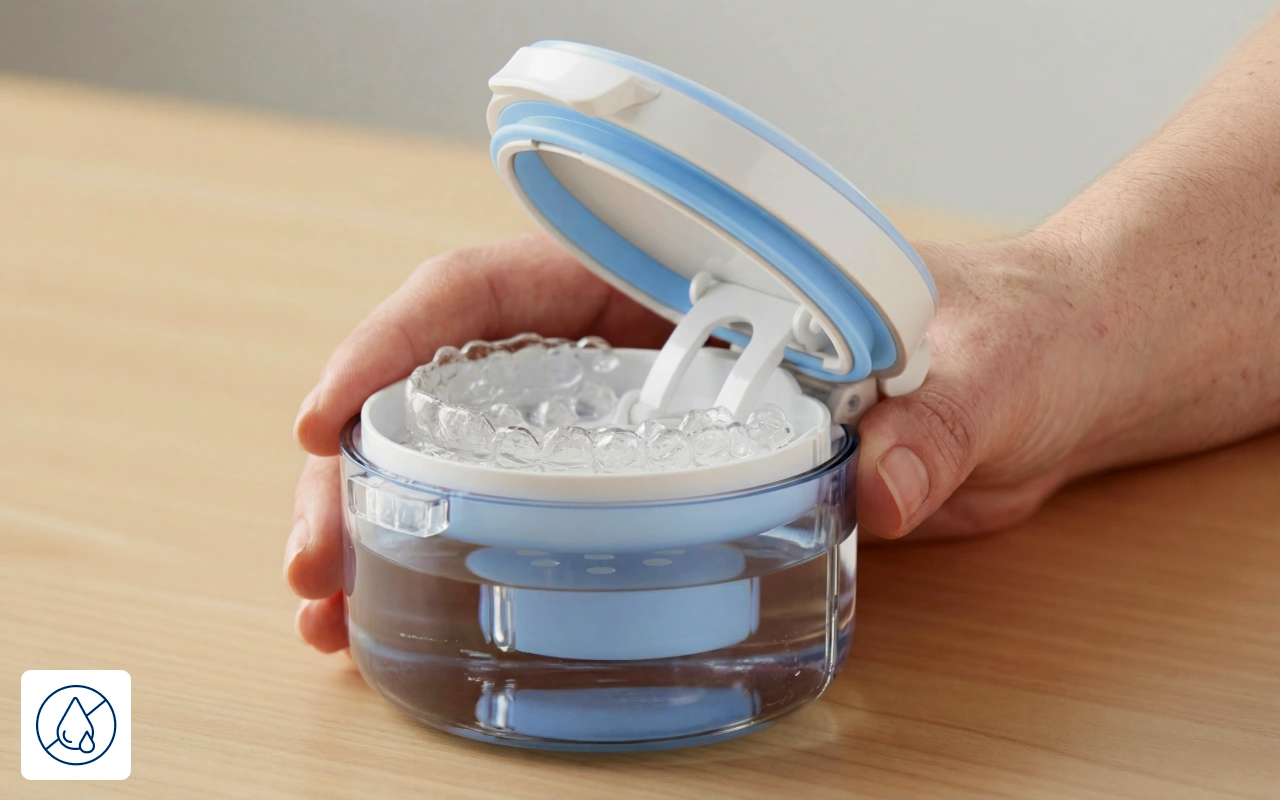 Je porte un appareil de contention en permanence et ce petit boîtier vit dans mon sac de travail. Il reste bien fermé, pas de fuites, et se rince parfaitement en quelques secondes.