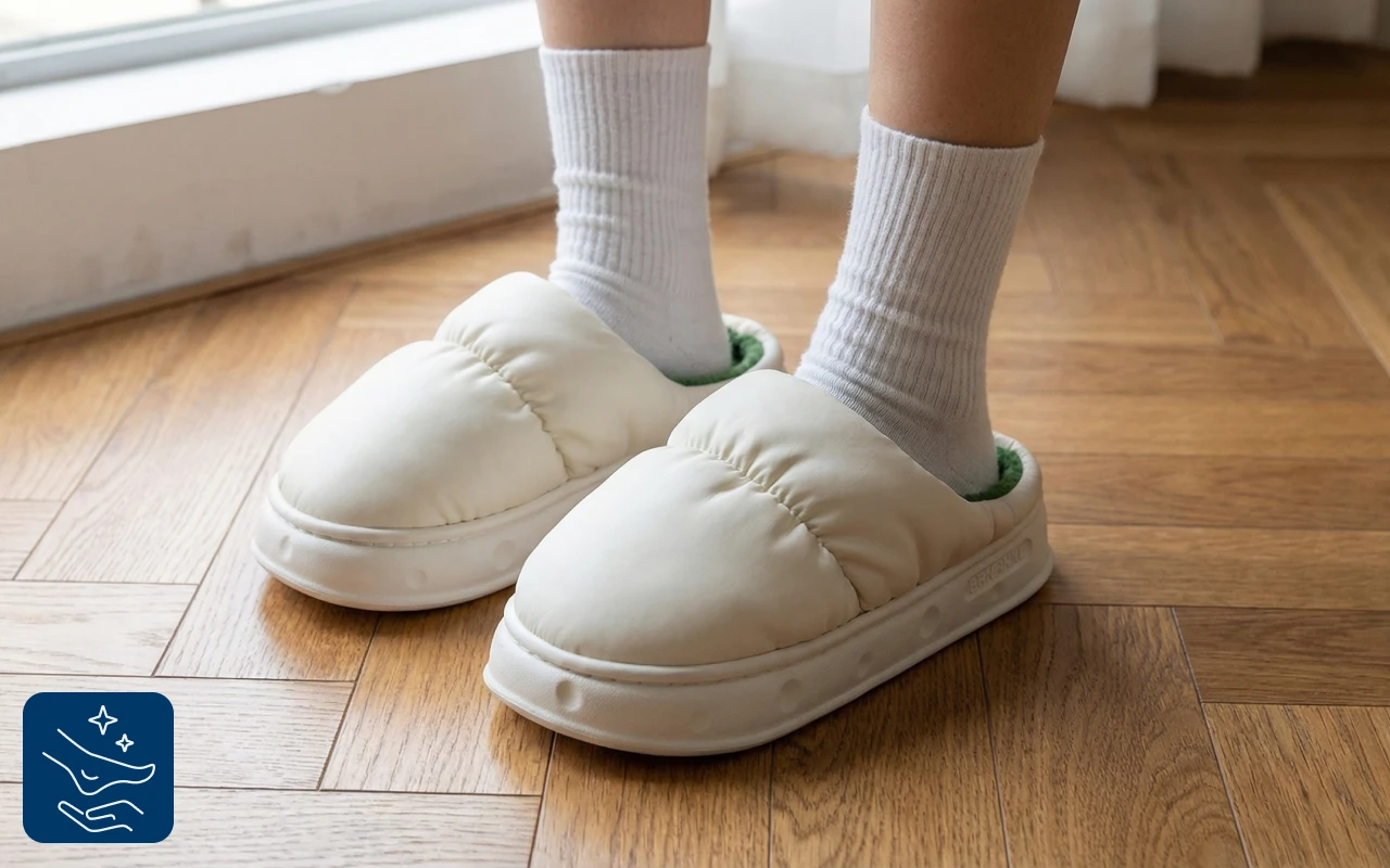 Ces chaussons duveteux sont tellement confortables et gardent mes pieds bien au chaud les matins froids. Aucune pression ni sensation de serrage, juste du confort doux à chaque pas.
