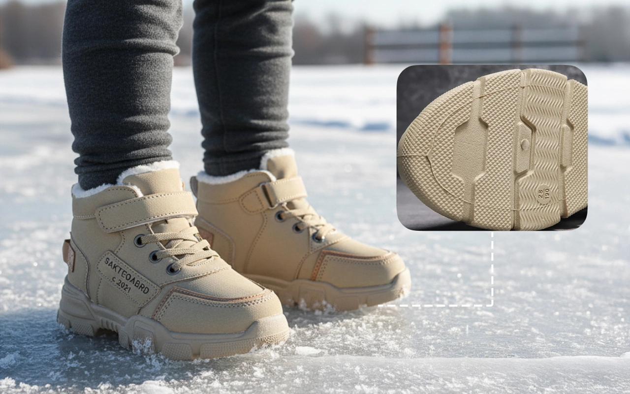 Des semelles spécialement conçues offrent une adhérence optimale pour éviter les chutes inattendues. Les enfants peuvent courir, sauter et marcher en toute sécurité sur les surfaces glissantes à l'extérieur.