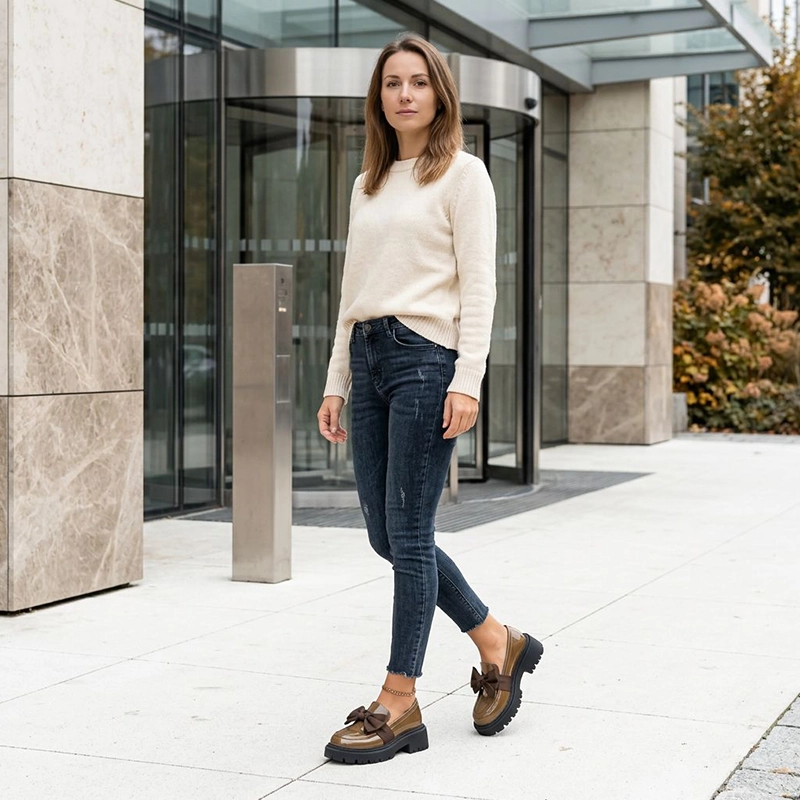 La silhouette britannique classique se marie parfaitement avec jeans, jupes et robes. Les plateformes Ortorex passent des cours aux dîners, évitant les changements de tenue.